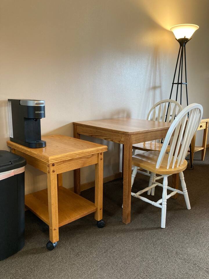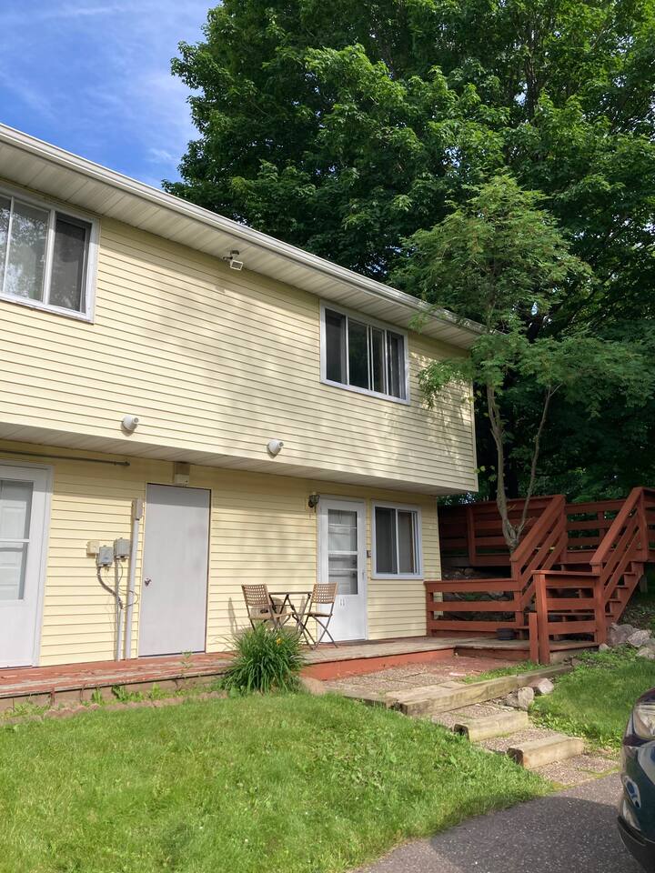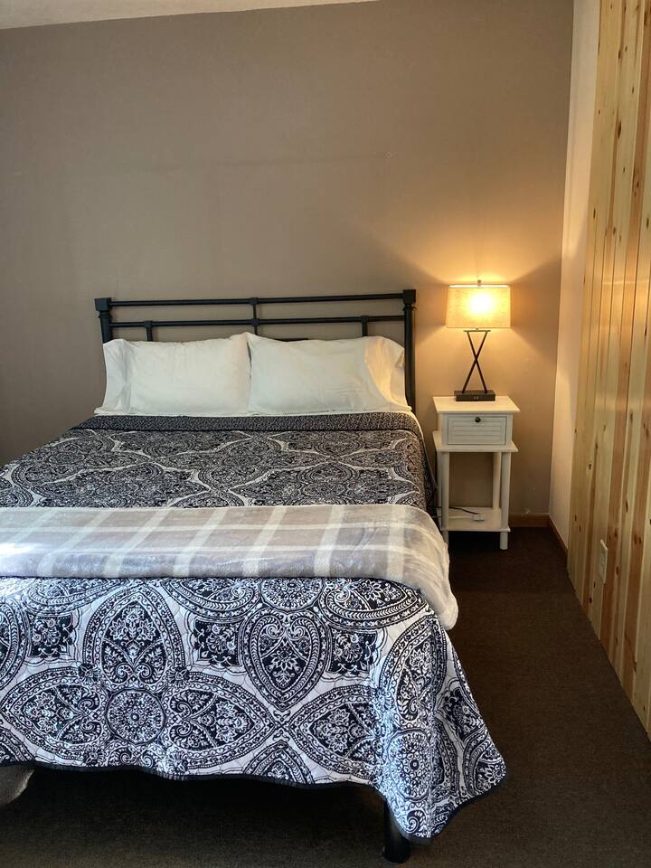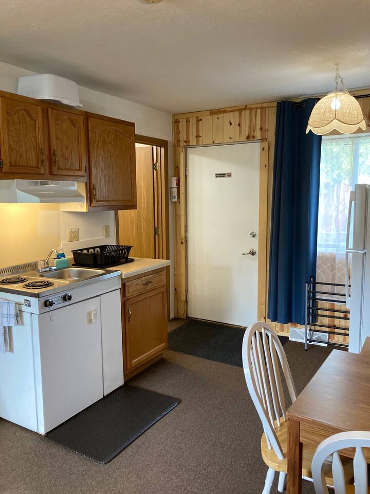 What You'll find in the Unit: Centrally located in Park Falls, WI. Queen size bed. Comfortable bed with fresh bedding. 2 Burner Cook top – Kitchenette. Full Size Refrigerator. Microwave. Basic cookware: pots, pans, dishes, utensils. TV with Roku for streaming / using your own log-ins. AC/heat unit for your comfort. Small table and chairs. Hanging wardrobe space. Private bathroom with shower, toilet, and sink. WI-FI. We start you off with a set of towels, bedding, toilet paper, trash bags, and general cleaning supplies. This kitchenette studio is a private unit within a small 3-unit inn. Each unit has its own entrance and amenities, providing a cozy, fully furnished, budget-friendly place to stay that's kept exceptionally clean.